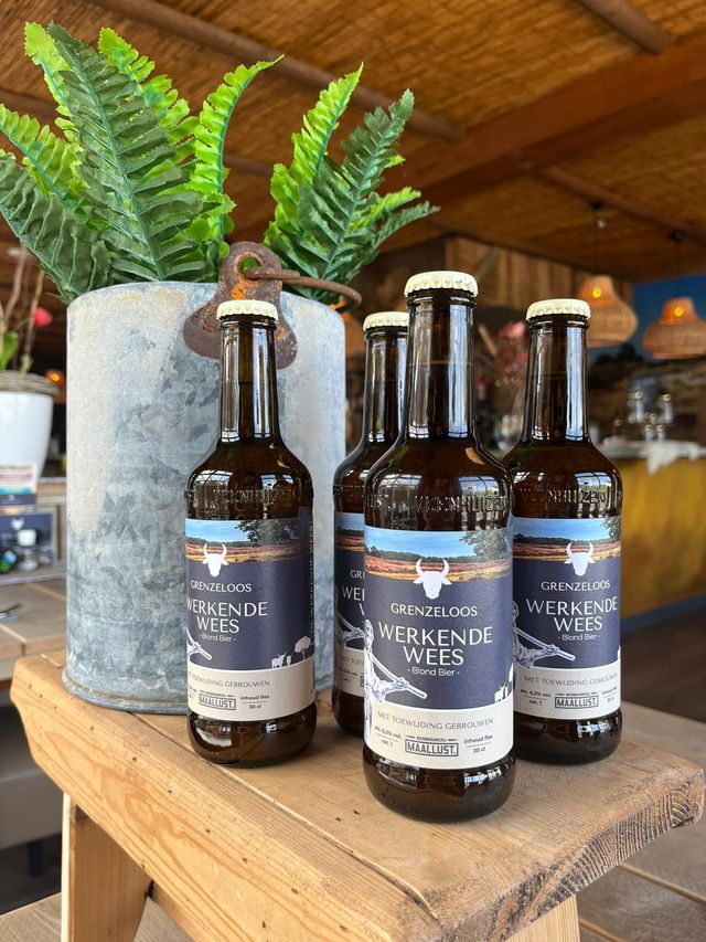 In het restaurant verkopen we ook ons eigen biertje, de Werkende Wees. Grenzeloos heeft in samenwerking met brouwerij maallust een speciaal biertje ontwikkeld geïnspireerd door het verhaal van Cornelis de Vogel dat wordt verteld in ons bezoekerscentrum.