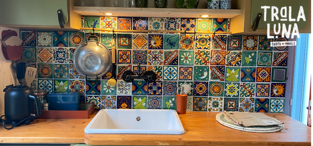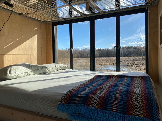 Het tweepersoonsbed is aan een zijde voorzien van een groot raampartij, met vrij uitzicht. De badkamer naast een toilet een ruime douche met glasplafond waardoor je onder de sterrenhemel kunt douchen. De leefruimte is verder voorzien van vintage stoelen, een tafel om aan te eten of schrijven en een kleurrijke open keuken.