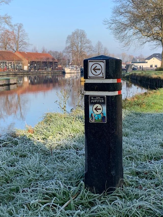 Deze route is bewegwijzerd met bordjes met daarop 'Dwingeler Ommetje Jupiter'.